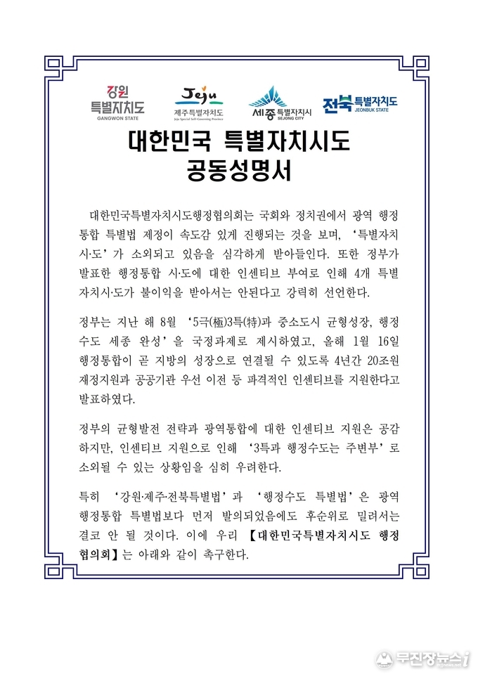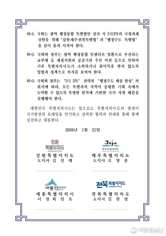 특별자치시‧도 행정협의회는 이번 공동성명을 통해 ▲광역 행정통합 특별법안 심사 시 ‘전북·강원·제주특별법’과 ‘행정수도 특별법’의 동시 국회 처리 ▲행정통합 인센티브 부여에 따른 특별자치시·도의 소외 방지 ▲5극3특 국가전략에 따른 공정한 자원 배분을 촉구했다.