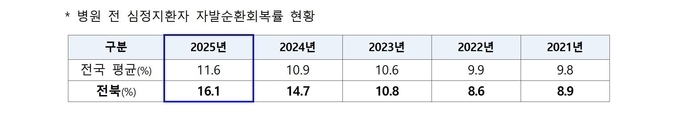 이러한 주요정책 추진결과 2025년 전북특별자치도 심정지 환자 자발순환회복률이 2024년 14.7%보다 1.4%p 상승한 16.1%를 기록했다고 밝혔다.