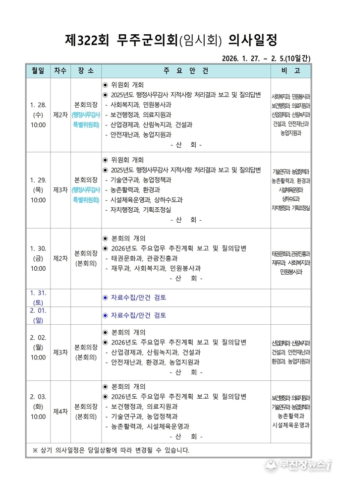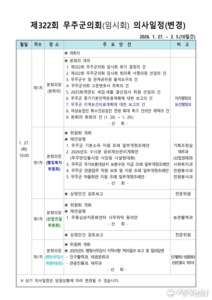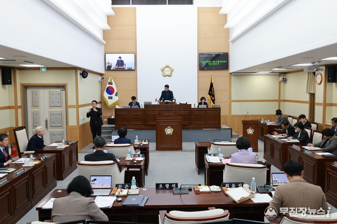 회기 첫날인 27일 무주군의회는 제1차 본회의를 열어 2025회계연도 세입·세출 결산검사 위원(대표위원 문은영)을 선임했다. 그리고 이영희 의원이 대표 발의한 「여성농업인 특수건강검진 연령 확대 촉구 건의안」을 의원 만장일치로 채택했다.