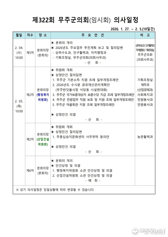 올해 처음 열리는 이번 임시회는 2월 5일까지 10일간 진행되며, 2026년도 주요업무 추진계획 청취를 비롯해 2025년도 행정사무감사 지적사항 처리결과 보고, 조례안 및 공유재산계획안 등 6건의 안건을 심사하며 군정 전반의 운영 방향을 점검할 계획이다.