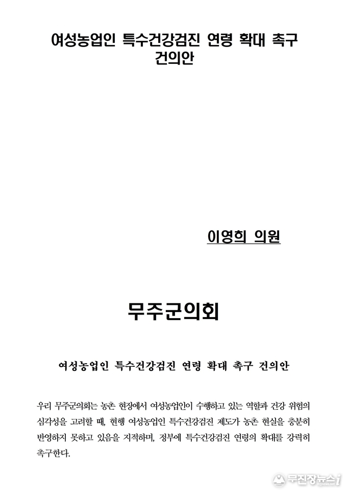 무주군의회는 이 같은 취지에 공감하며 결의안을 채택하고 ▲현행 51~80세로 제한한 여성농업인 특수건강검진 연령을 45세 이상 모든 여성농업인으로 확대 ▲농촌 의료접근성을 고려해 찾아가는 검진서비스 확대와 검진항목 강화, 사후관리체계 구축 ▲여성농업인 특수건강검진 사업의 안정적 추진을 위한 국비 지원 확대와 자지체 재정부담 완화를 위한 실질적 재정 지원 방안을 마련할 것을 촉구하며 이를 정부에 공식 요구하기로 했다.
