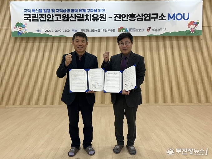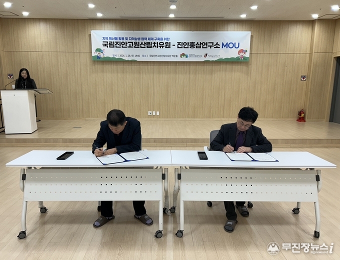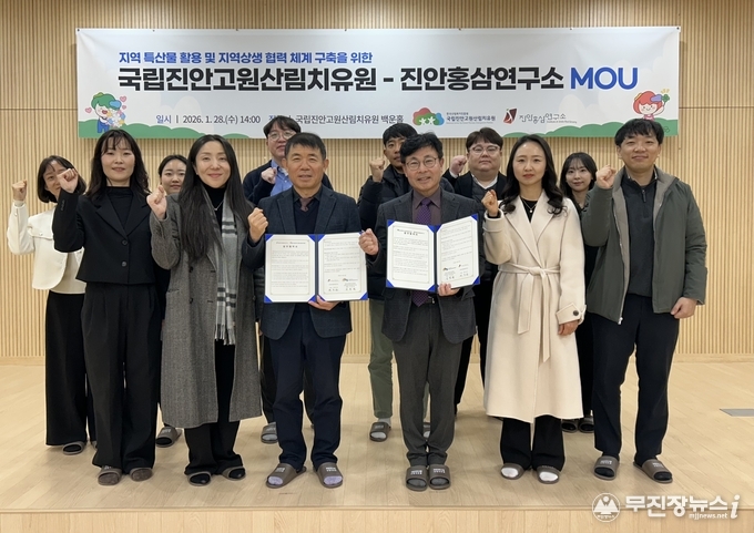 (재)진안홍삼연구소(이하 홍삼연구소, 연구소장 현동윤)와 한국산림복지진흥원 국립진안고원산림치유원(이하 치유원, 원장 김창현)은 지역 특산물을 활용한 산림 치유 프로그램 개발과 지역상생 기반 협력체계 구축을 위해 업무협약(MOU)을 체결했다.