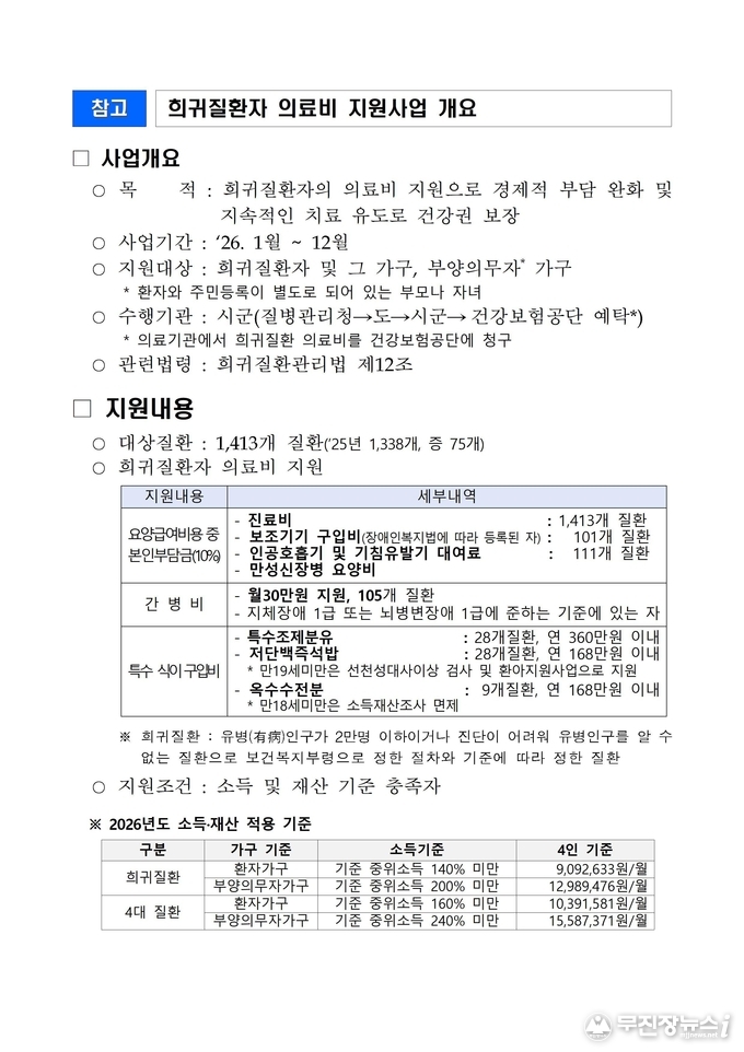 전북특별자치도는 2026년 1월부터 희귀질환자 의료비 지원사업의 대상 질환을 기존보다 75개 확대해 총 1,413개 질환으로 늘린다고 29일 밝혔다. 이번 조치는 치료 기간이 길고 의료비 부담이 큰 희귀질환자의 경제적 부담을 완화하고, 보다 촘촘한 의료 안전망을 구축하기 위한 것이다.