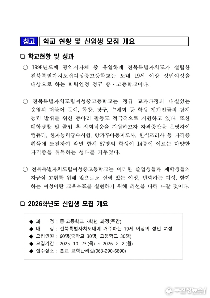 한편, 도립여성중고교는 오는 2월 3일까지 2025년 신입생 60명(중 30명, 고 30명)을 모집한다. 도내 거주 19세 이상 성인 여성이면 누구나 지원가능하다.