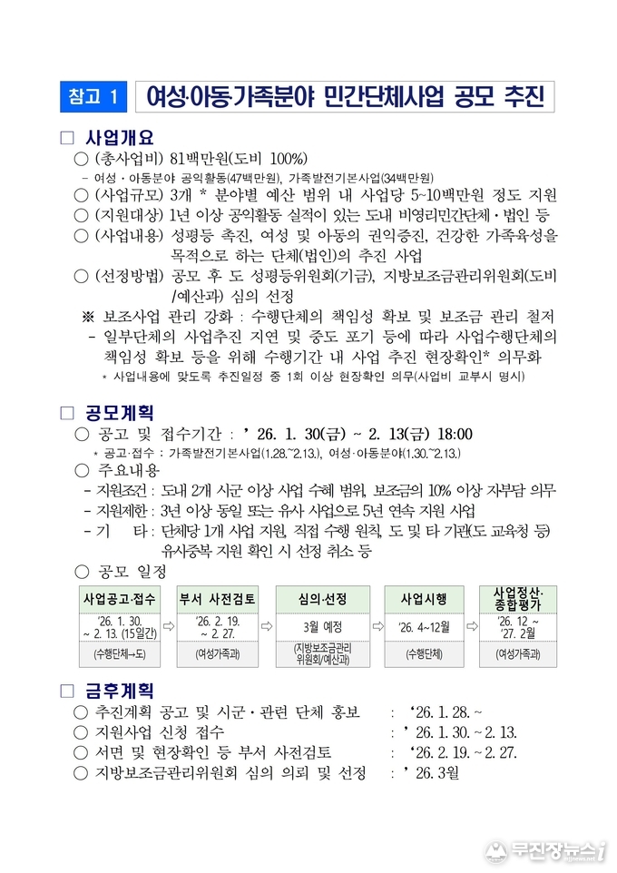 이미숙 전북특별자치도 여성가족과장은 “이번 공모를 통해 지역사회 현장에서 공익적 가치를 실현하는 민간단체의 활동을 적극 뒷받침하겠다”며, “도민이 체감할 수 있는 실질적인 사업이 추진될 수 있도록 선정 이후에도 사업 관리와 지원에 최선을 다하겠다”고 밝혔다.