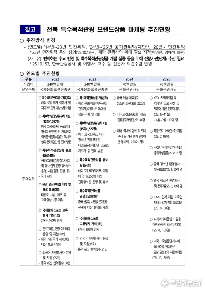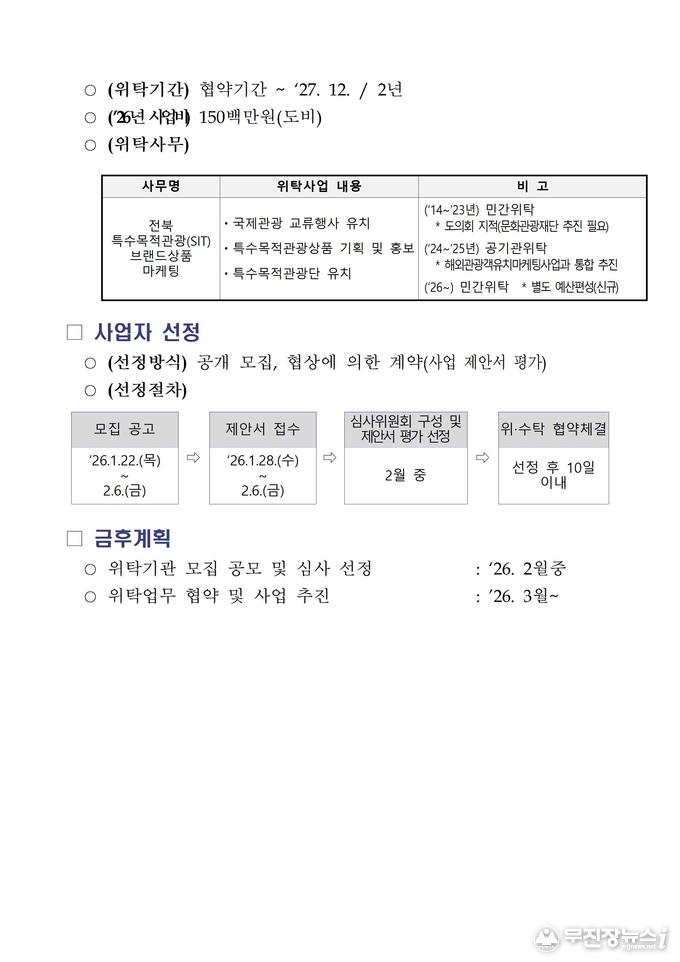 이번 사업은 「전북특별자치도 관광진흥에 관한 조례」 제10조와 제11조에 근거해 추진되며, 위탁기간은 협약 체결일부터 2027년 12월까지 2년이다. 2026년에는 도비 1억5,000만 원이 투입된다.