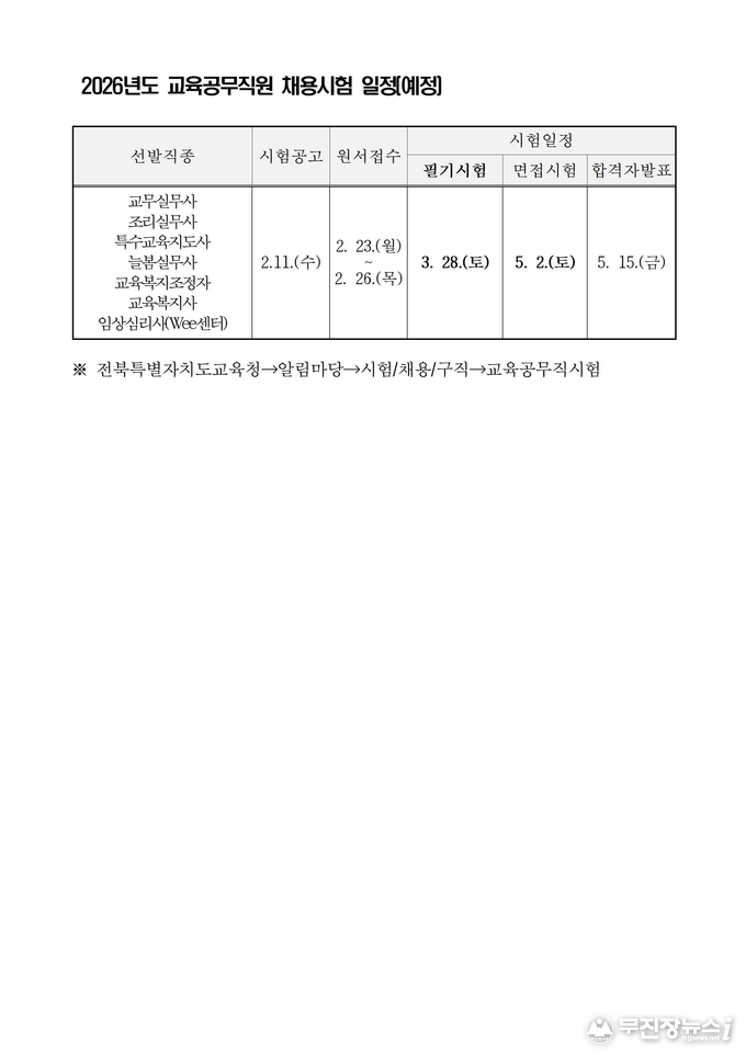 전북특별자치도교육청은 교육공무직원 채용시험을 준비하는 응시자의 편의를 위해 2026년 교육공무직원 채용시험 일정을 4일 누리집을 통해 사전 안내했다.