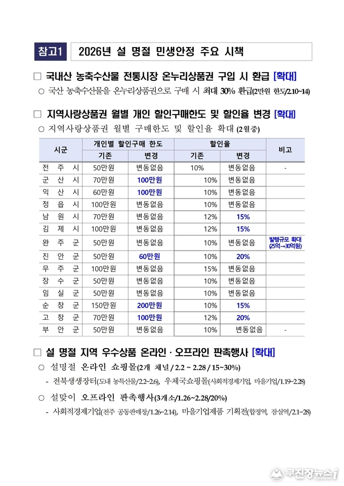 특히 설 명절을 맞이하여 달라지는 정책으로는 지역경제 활력 제고를 위해 △국내산 농축수산물 온누리상품권으로 구매 시 당일 구매금액의 최대 30% 환급(2만원 한도/2.10~14) △지역사랑상품권 구매한도(최대 200만원) 및 할인율(최대 20%) 확대 △대중교통(철도, 시외버스 등) 증편 및 고속도로 통행료 감면 △ 문여는 병의원·약국 확대 운영 등을 추진한다.