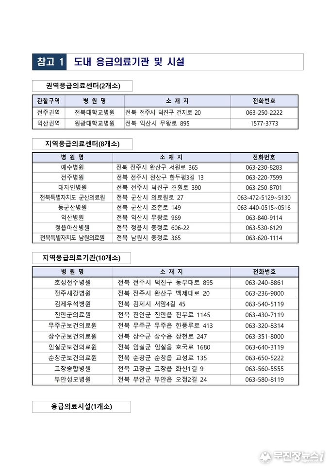 연휴 기간 도내 응급의료 공백을 최소화하기 위해 응급의료기관 20개소와 응급의료시설 1개소는 평소와 동일하게 24시간 진료체계를 유지한다..