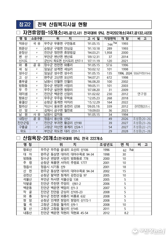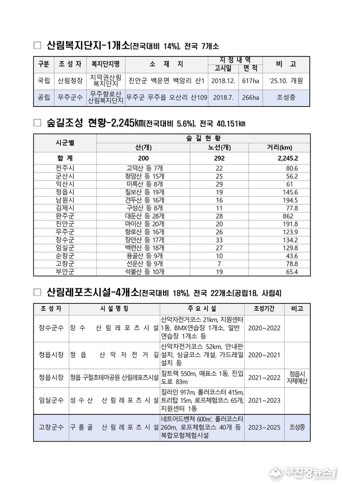 도는 2026년까지 ▲정읍·진안·고창·부안에 자연휴양림 4곳, ▲전주·정읍에 치유의 숲 2곳, ▲무주·순창에 산림복지단지 2곳을 새로 조성하고, 도내 숲길 106km를 정비해 도민들이 보다 안전하고 쾌적하게 숲을 이용할 수 있는 환경을 마련할 계획이다.