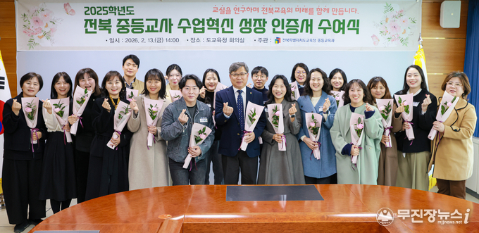 전북특별자치도교육청은 13일 5층 회의실에서 ‘2025학년도 중등교사 수업혁신 성장인증서 수여식’을 개최하고, 교실수업 혁신을 선도한 우수교사를 인증했다.