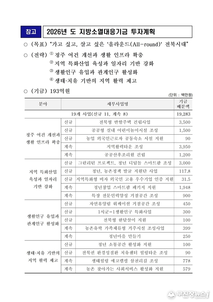 전북특별자치도가 인구 감소 위기에 적극 대응하기 위해 올해 지방소멸대응기금 193억 원을 투입한다. 도민 체감도가 높은 사업에 예산을 집중 배치해 지역 활력을 끌어올린다는 계획이다.