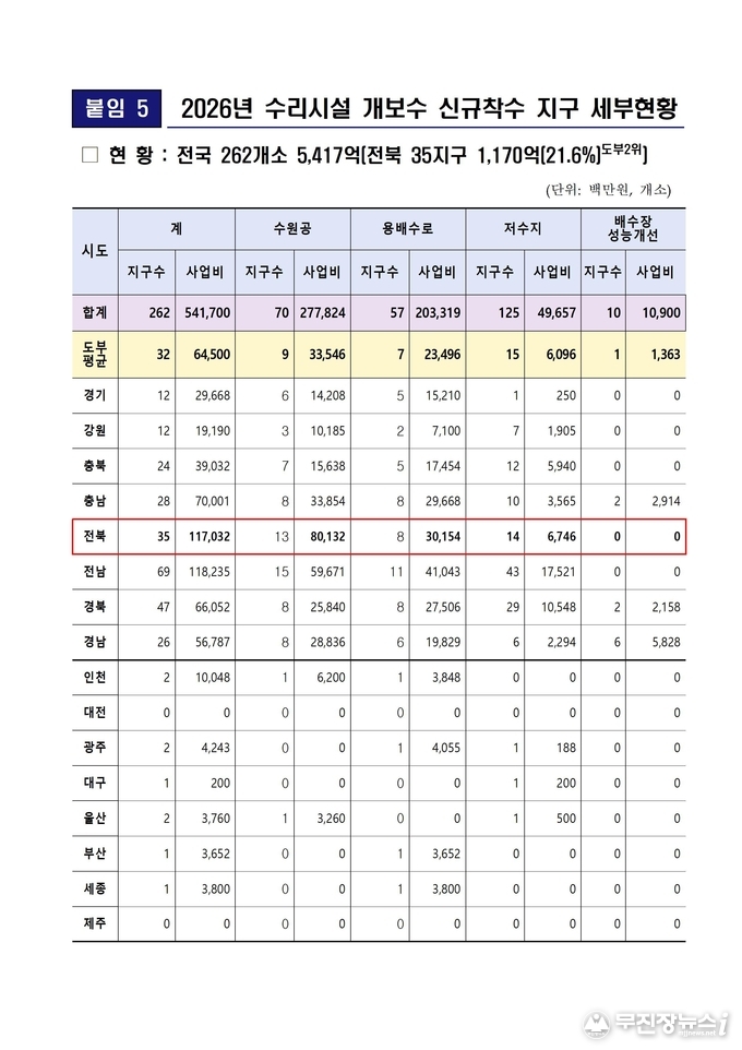 수리시설개보수사업은 노후 저수지, 양·배수장, 용·배수로 등을 보강해 시설 안전성과 용수공급 기능을 개선하는 사업이다. 신규착수 35개 지구가 선정돼 1,170억원을 확보했다.