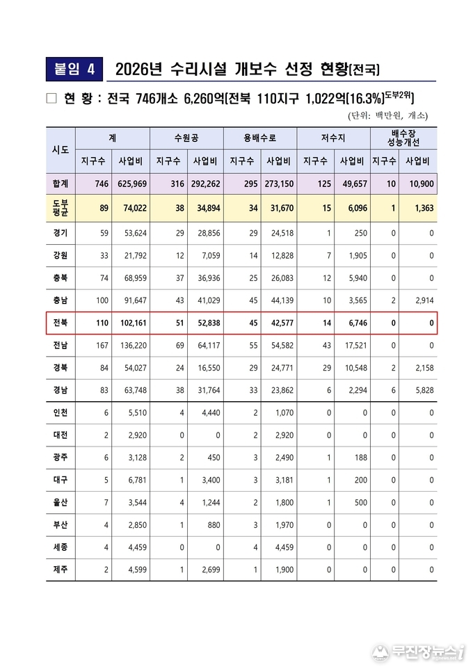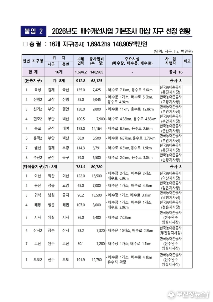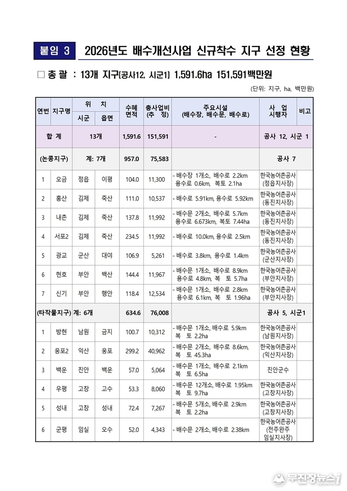 전북특별자치도는 농림축산식품부가 추진하는 2026년도 농업생산기반정비사업에 배수개선사업 29개 지구와 수리시설개보수사업 35개 지구 등 총 64개 지구가 선정돼 국비 4,175억 원을 확보했다고 19일 밝혔다.