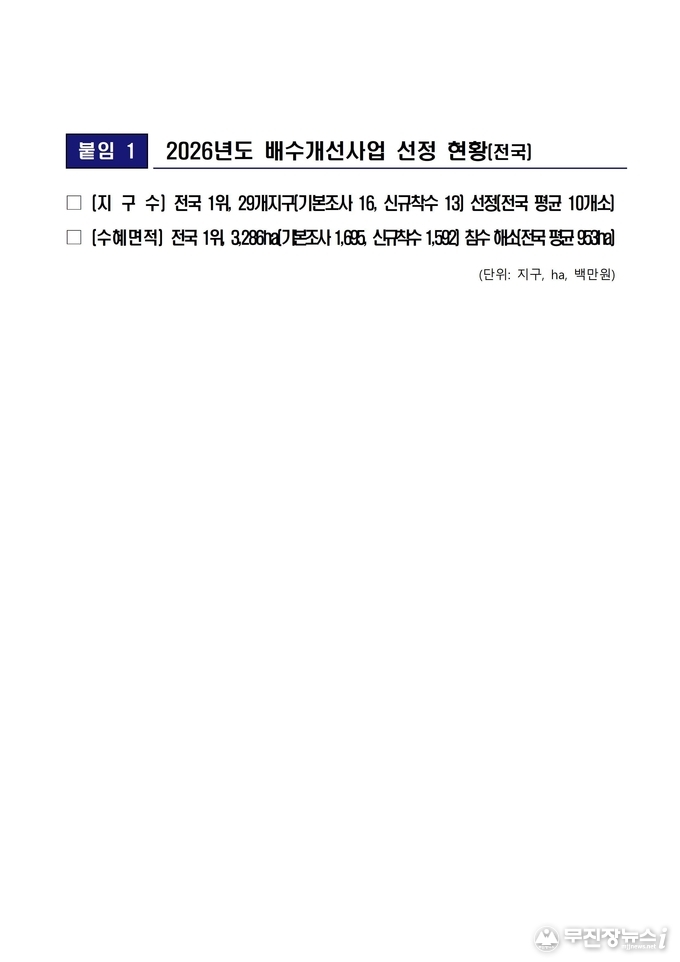 배수개선사업은 집중호우 시 침수 피해가 반복되는 농경지를 대상으로 배수장, 배수로 등을 정비·확충하는 사업이다. 기본조사 지구 16개소(1,489억원, 1,694ha), 신규착수 지구 13개소(1,516억원, 1,592ha)가 선정됐으며, 총 수혜면적은 3,286ha로 전국 평균(953ha)을 크게 상회한다.