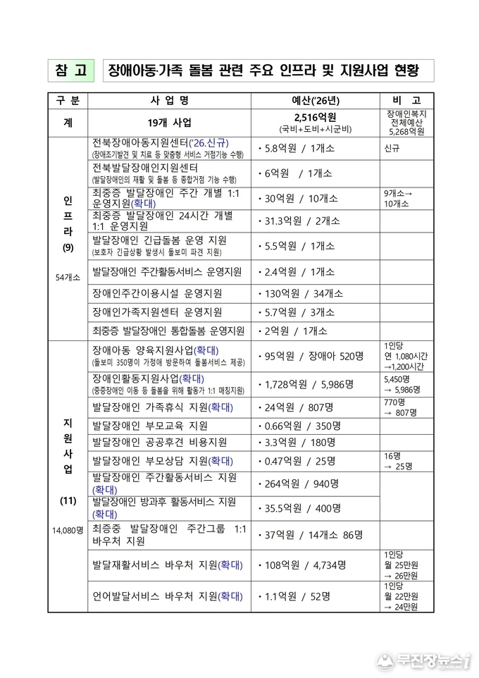 전북특별자치도가 2026년 장애아동과 가족을 위한 돌봄예산 2,516억 원을 투입하고 촘촘한 돌봄망 구축에 본격 나선다고 23일 밝혔다. 이는 장애인복지 전체 예산 5,268억 원의 48%에 해당하는 규모로, 지난해 2,146억 원보다 370억 원 증가한 역대 최대 수준이다.