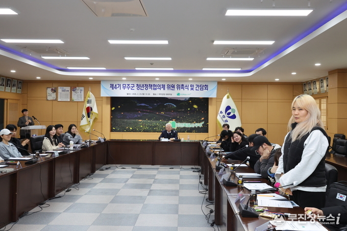 무주군이 지역 내 청년들과의 적극적인 소통에 나선다. 무주군에 따르면 지난 23일제4기 무주군 청년정책협의체 위원들을 위촉하고 황인홍 무주군수를 비롯한 청년 위원 29명이 함께 간담회를 가졌다.