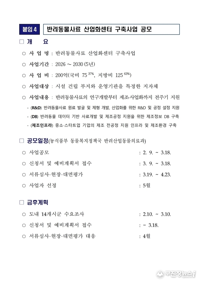 전북특별자치도가 반려동물 연관산업을 미래 성장 전략산업으로 육성하기 위해 ‘반려동물사료 산업화센터 구축사업’ 공모 대응에 나섰다.