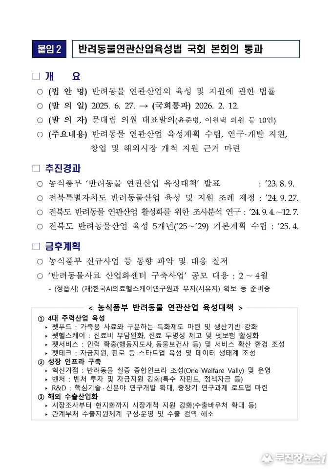 민선식 전북자치도 농생명축산산업국장은 “이번 법률 제정으로 반려동물 연관산업이 국가 차원의 미래 전략산업으로 공식화됐다”며 “공모사업을 반드시 유치해 반려동물 산업을 전북의 새로운 성장 동력으로 육성하겠다”고 밝혔다.