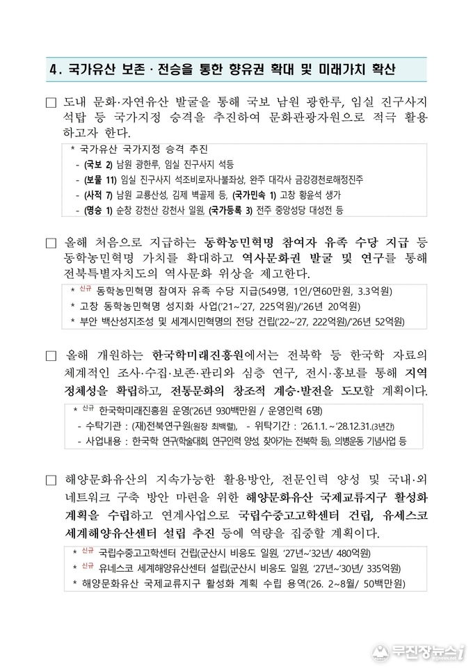 도는 국가유산의 체계적 보존과 활용을 통해 도민의 문화 향유 기반을 확대하고, 이를 미래 성장 자원으로 연결할 계획이다. 남원 광한루, 임실 진구사지 석등 등 도내 문화·자연유산을 발굴해 국보·보물·사적 등 25건의 국가지정을 단계적으로 추진하고, 동학농민혁명의 역사적 가치를 확산하기 위해 유족 수당을 올해 처음 지급하는 한편 고창·부안 일대 성지화 사업과 세계시민혁명의 전당 건립도 이어간다.