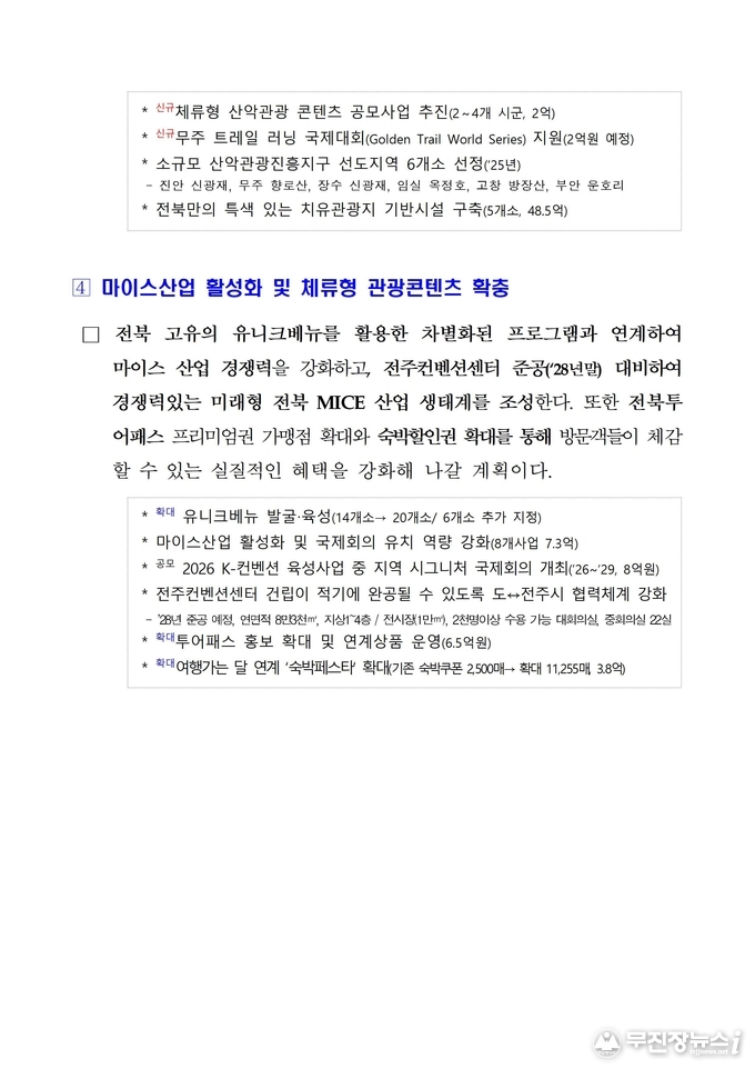 2028년 완공 예정인 전주컨벤션센터를 중심으로 전북 특화 AI·농생명 기반 국제회의를 유치해 마이스(MICE) 산업 경쟁력을 높인다. 또한 전북투어패스 프리미엄권 가맹점과 숙박 할인권(1만 1,255장) 확대 지원 관광객의 실질적인 소비와 체류를 이끌어낼 방침이다.