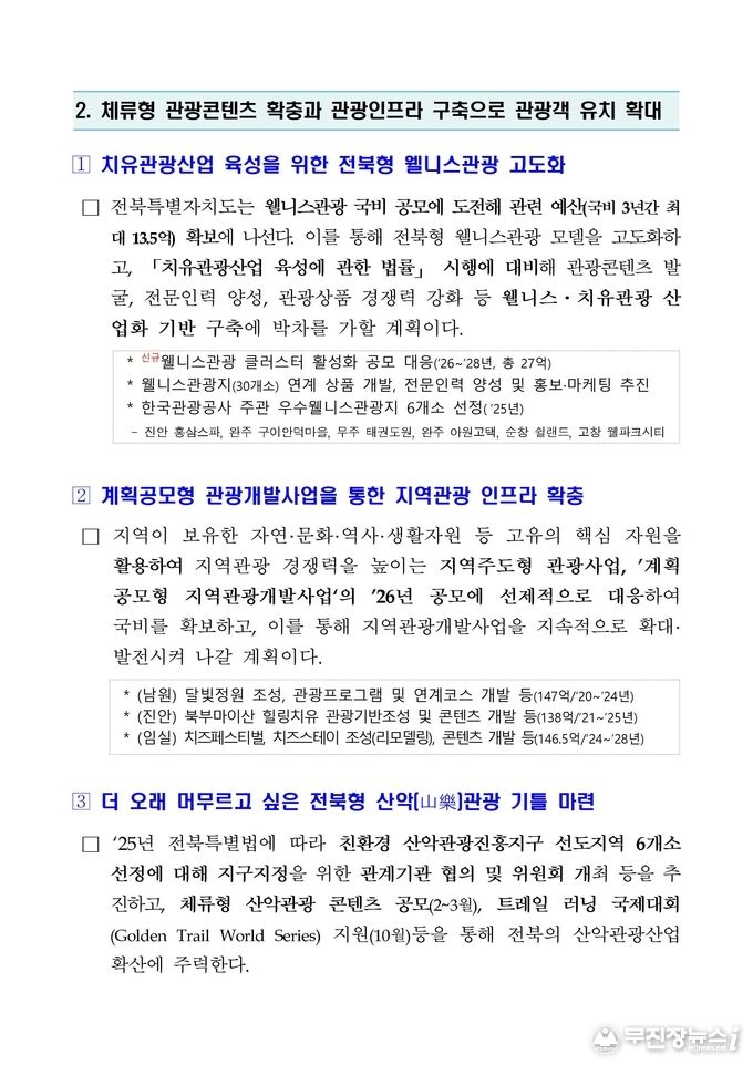관광산업 분야에서는 ‘웰니스·치유 관광’을 새로운 성장축으로 삼는다. 전북형 웰니스 관광지 30개소를 기반으로 클러스터 활성화 공모에 대응하고, 4월 시행되는 「치유관광산업법」에 맞춰 기반을 구축한다. 계획공모형 지역관광개발사업을 통해 5년간 최대 138억 원을 투입, 체류형 거점을 조성하며 6개 시군에 대한 친환경 산악관광 지구지정도 추진한다.