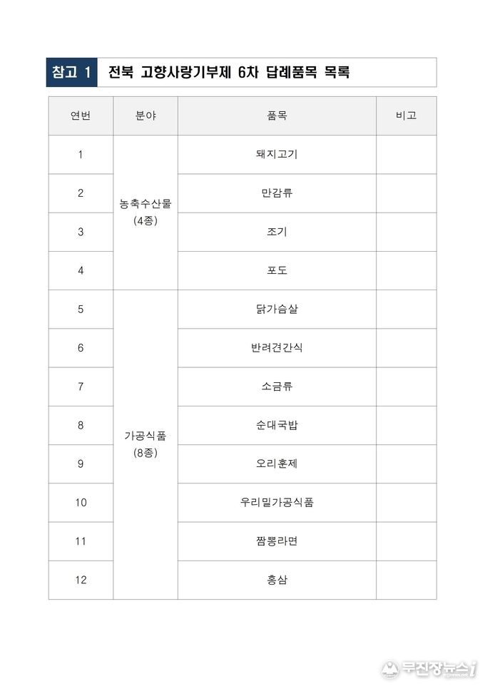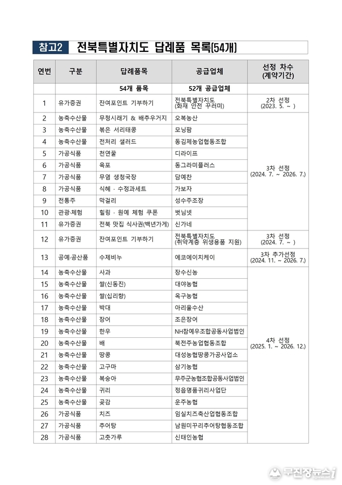 한편 전북자치도는 현재 도내 우수 농축수산물과 가공식품, 공예‧공산품, 유가증권, 관광상품 등 총 54종을 고향사랑기부제 답례품으로 제공하고 있다.