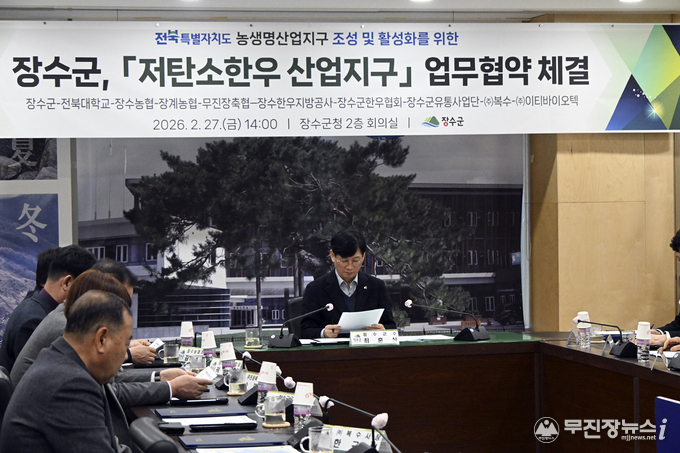 장수군은 27일 군청 2층 회의실에서 전북특별자치도 농생명산업지구로 지정된 ‘저탄소한우 산업지구’의 성공적인 조성과 활성화를 위해 관계기관‧단체와 업무협약(MOU)을 체결했다.