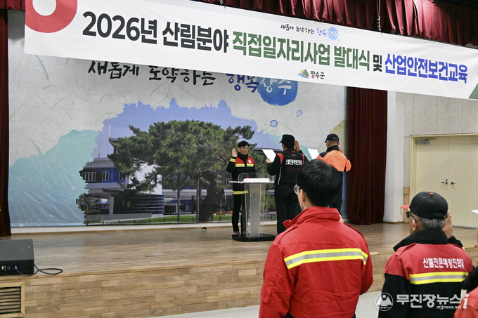 장수군은 3일 군청 1층 군민회관에서 ‘2026년 산림청 직접일자리사업 발대식 및 산업안전보건교육’을 개최하고 안전하고 체계적인 산림사업 추진을 위한 힘찬 출발을 알렸다.