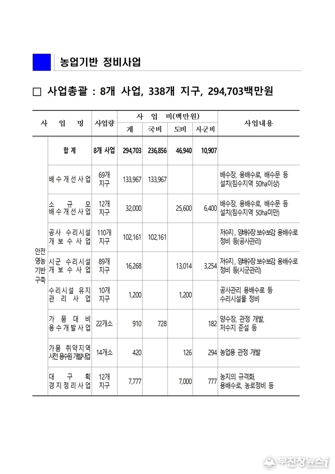 안정적인 영농 기반 구축과 가뭄 대응력 강화를 위해 올해 8개 농업기반 정비사업, 338개 지구에 총 2,947억 원 규모의 사업비도 투입한다.