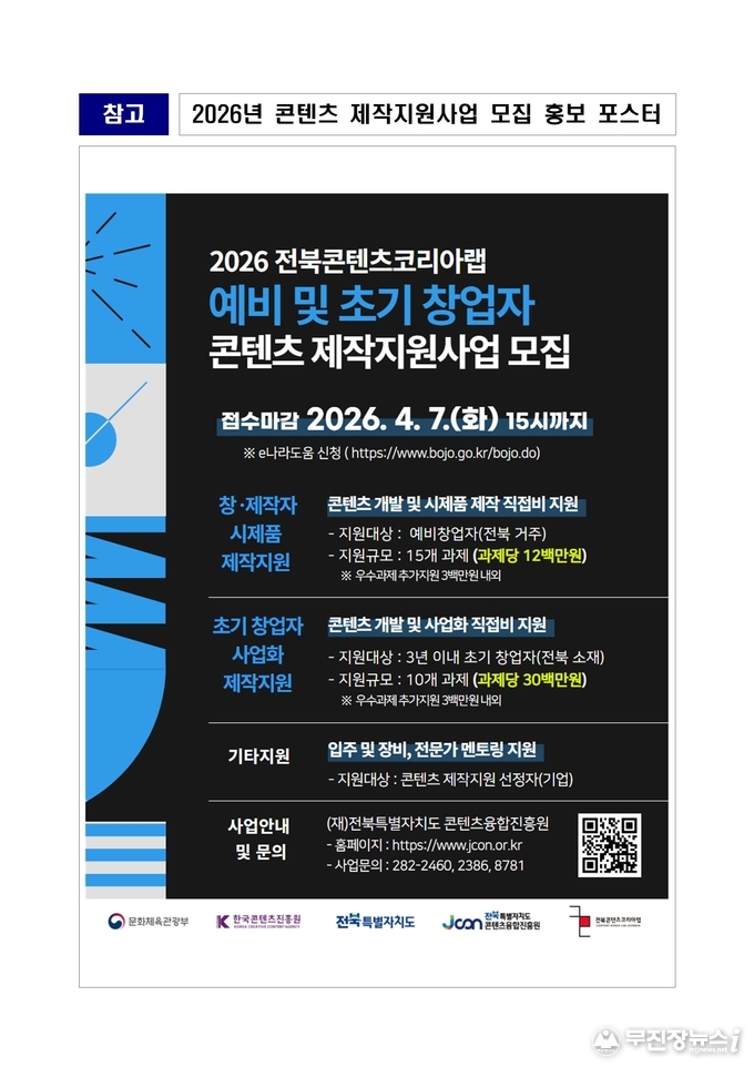 (재)전북특별자치도 콘텐츠융합진흥원(이하 진흥원, 원장 김성규) 전북콘텐츠코리아랩은 콘텐츠 분야 예비 창업자와 3년 이내 초기 창업기업의 경쟁력 강화를 위한 콘텐츠 제작지원사업 참여자를 모집한다.