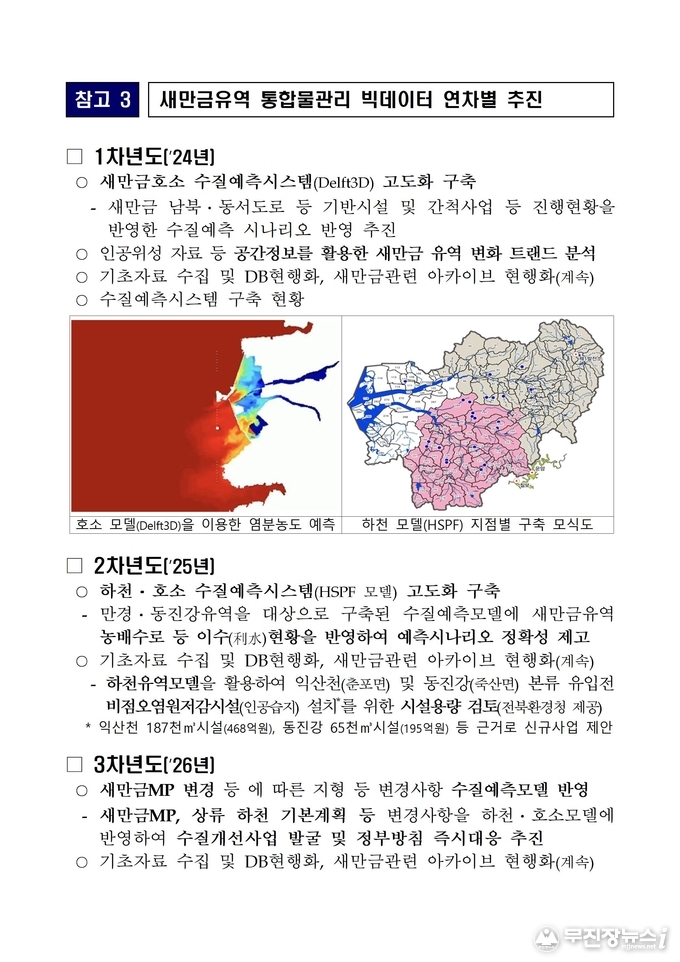 아울러, 과학적인 수질 관리를 위해 전북연구원이 구축한 ‘새만금유역 통합물관리 빅데이터 및 수질예측모델링 시스템’을 적극 활용한다. 도는 시군 환경 부서와 협력해 해당 빅데이터 시스템을 기반으로 비점오염 저감 등 과학적인 신규 수질개선 사업을 발굴하는 데 역량을 집중할 예정이다.