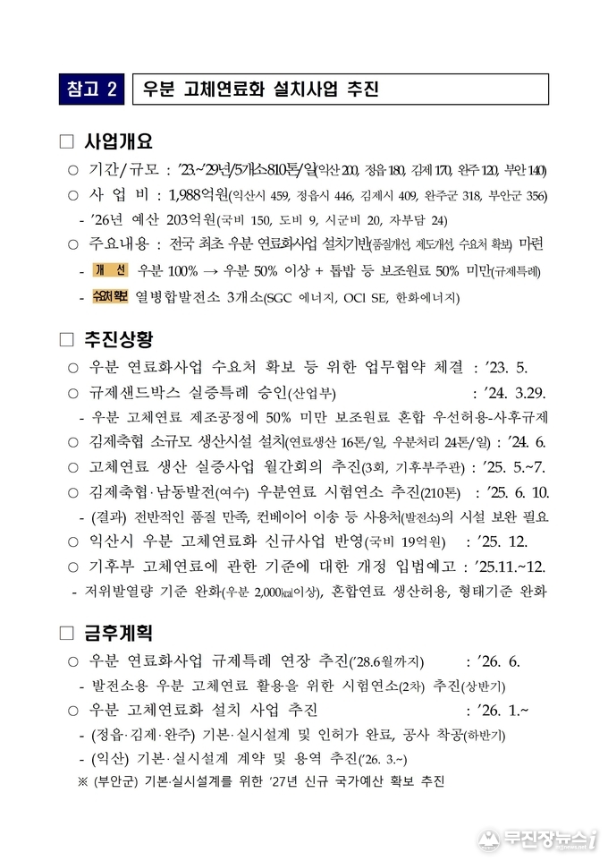 특히, 전북도청 컨소시엄(정읍, 부안, 김제·완주축협, 익산군산축협)은 우분 50% 이상과 톱밥, 왕겨 등 보조원료를 50% 미만으로 혼합해 고체연료를 생산·판매하는 '실증을 위한 규제특례'의 유효기간을 당초 2026년 6월에서 2028년 6월까지 2년 연장하는 방안을 추진한다. 이를 통해 가축분뇨법 등 관련 규제 법령이 개정되기 전까지 안정적으로 실증 데이터를 축적하고 사업의 연속성을 확고히 확보할 방침이다.