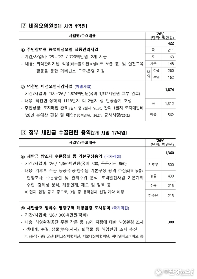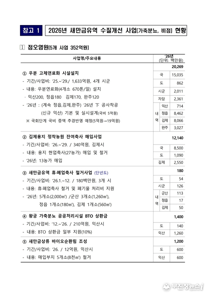 전북특별자치도는 올해 새만금 유역의 가축분뇨 적정 처리와 비점오염원 저감을 위해 편성된 총 6개 사업, 356억 원 규모의 예산이 적기에 집행될 수 있도록 시군 및 관계기관과 긴밀히 협력하며, 수질개선 핵심사업에 속도를 내고 있다고 17일 밝혔다.