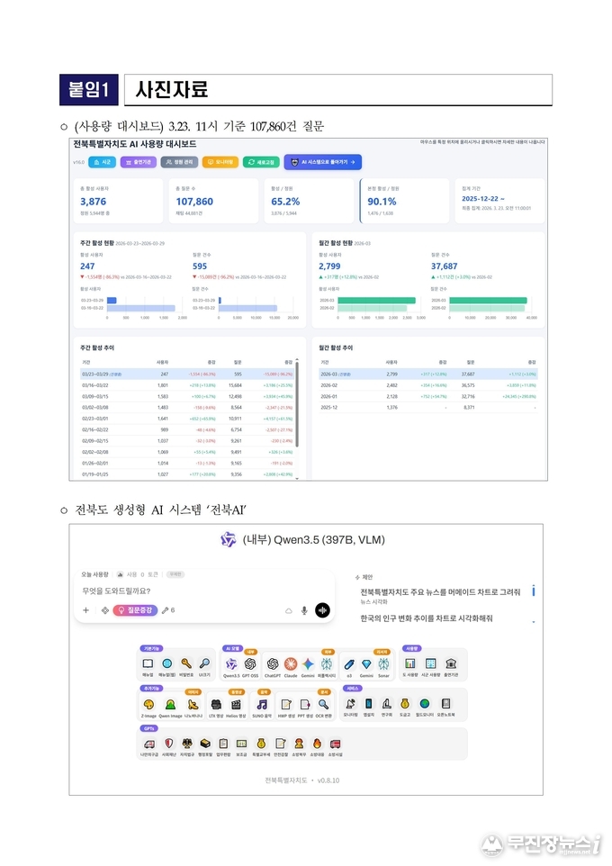 23일 도에 따르면, 전북자치도 생성형 AI 시스템은 지난 2025년 12월 22일 운영을 시작해, 이달 22일 기준 누적 질문 건수 10만 7,000건, 총 사용자 3,873명, 전체 사용률 65%를 기록했다. 특히 본청 사용률은 90%에 달해, 공공행정 전반에 걸친 AI 활용이 빠르게 일상 업무로 자리매김하고 있는 것으로 분석된다.