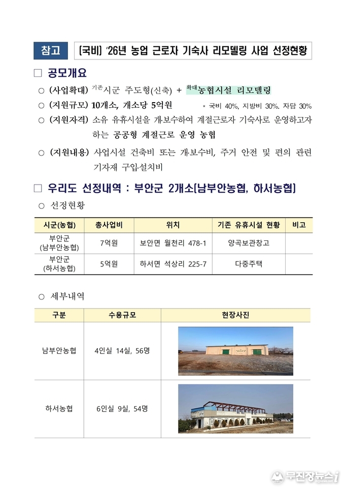 전북특별자치도는 농림축산식품부가 주관한‘2026년 농업근로자 기숙사 시설 리모델링 사업’공모에서 부안군‘남부안농협, 하서농협’2개소가 최종 선정되었다고 26일 밝혔다.