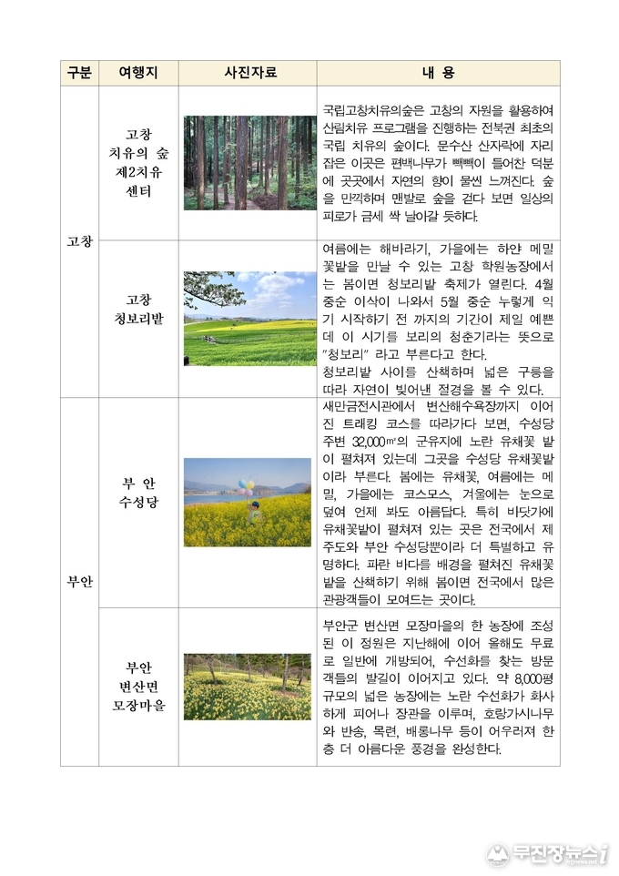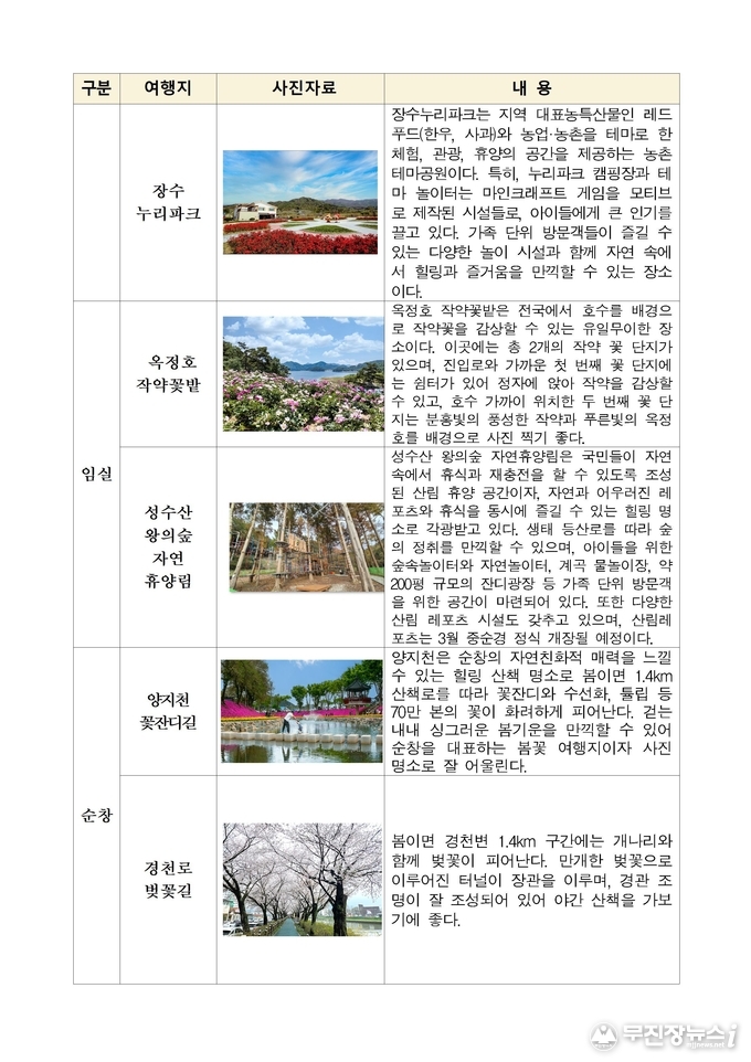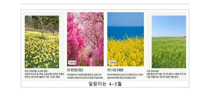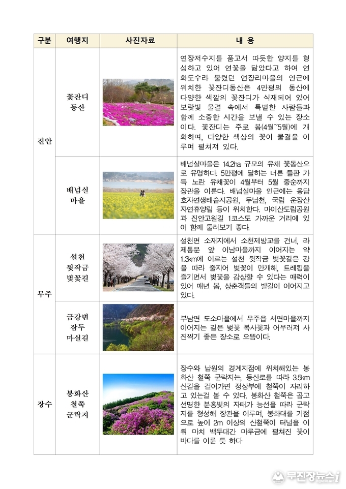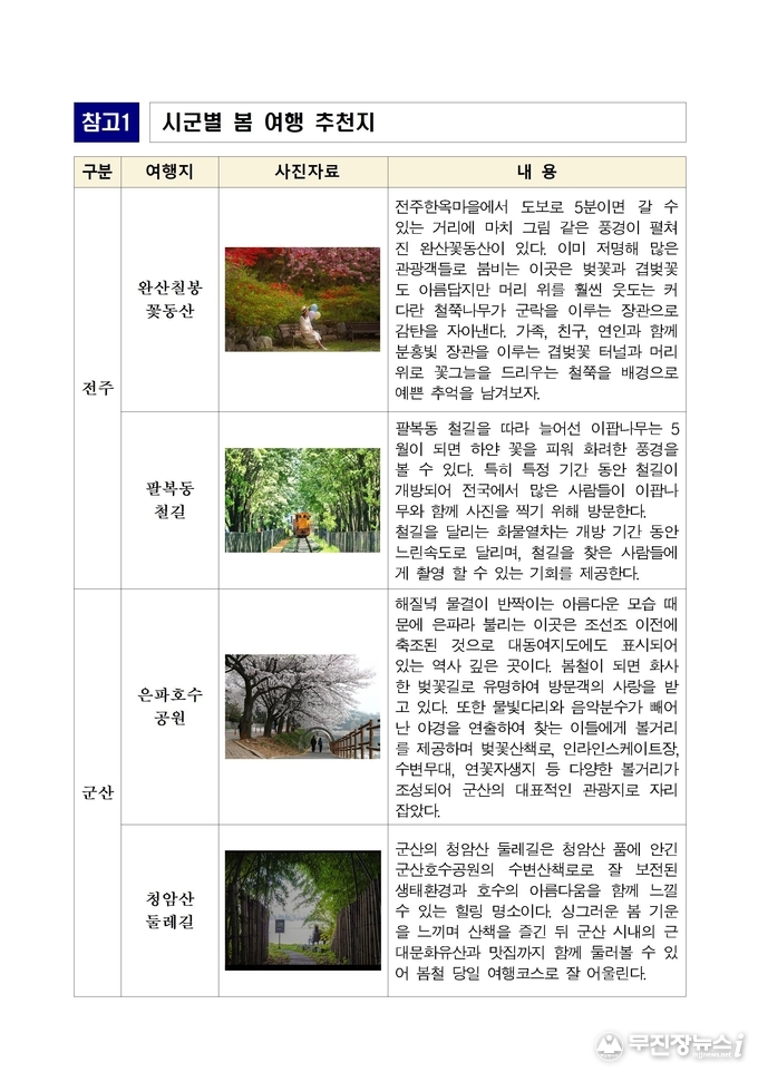 손미정 전북자치도 관광산업과장은“전북은 지역마다 서로 다른 매력을 지닌 봄꽃 관광지를 보유하고 있다”며“도민과 관광객들이 전북 곳곳을 방문해 계절의 아름다움을 즐기고 지역 관광 활성화에도 도움이 되기를 기대한다”고 말했다.