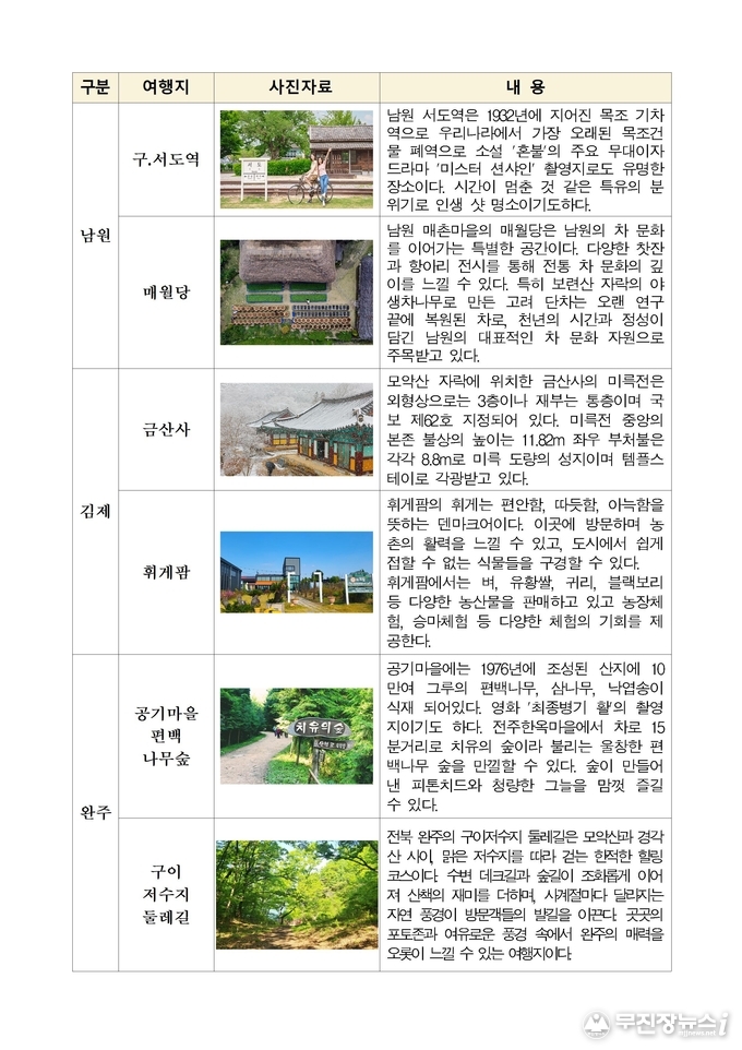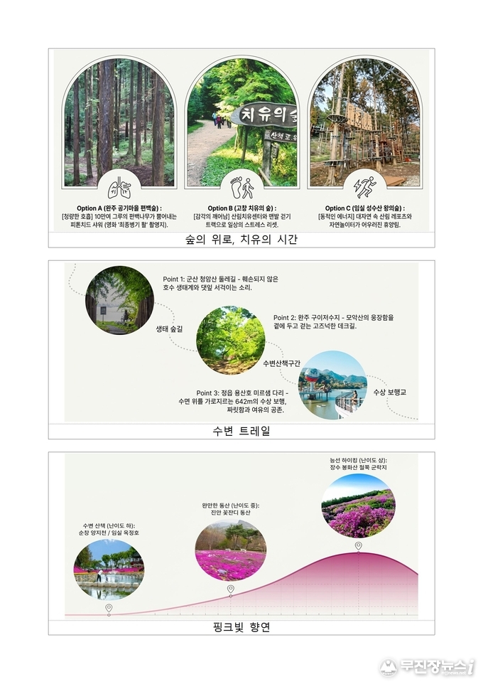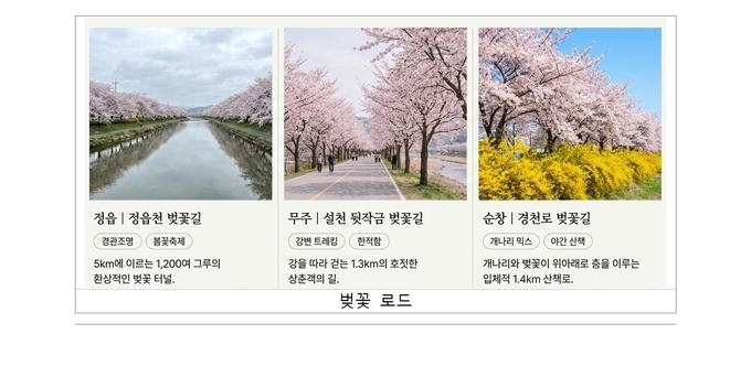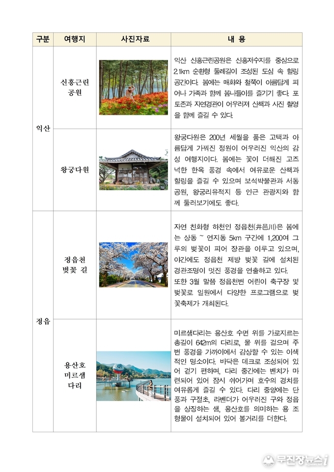 김제 금산사 벚꽃길과 완주 구이저수지 둘레길은 자연 속에서 여유로운 산책을 즐기기에 좋은 코스로, 무주 설천 뒷작금 벚꽃길과 금강변 마실길은 강을 따라 이어지는 벚꽃 풍경을 감상할 수 있는 명소다. 임실 옥정호 작약꽃밭은 호수를 배경으로 봄꽃을 즐길 수 있는 이색적인 장소로 주목받고 있다.