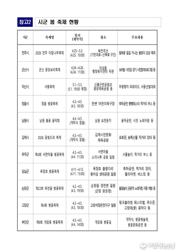 도는 봄꽃 관광과 연계한 지역 축제도 함께 즐길 수 있도록 안내하고 있다. 정읍 벚꽃축제(4.3.~4.5.), 순창 옥천골 벚꽃축제(4.2.~4.5.), 고창 벚꽃축제(4.3.~4.5.), 부안 개암동 벚꽃축제(4.3.~4.5.) 등 도내 곳곳에서 다양한 봄 축제가 열릴 예정이다.