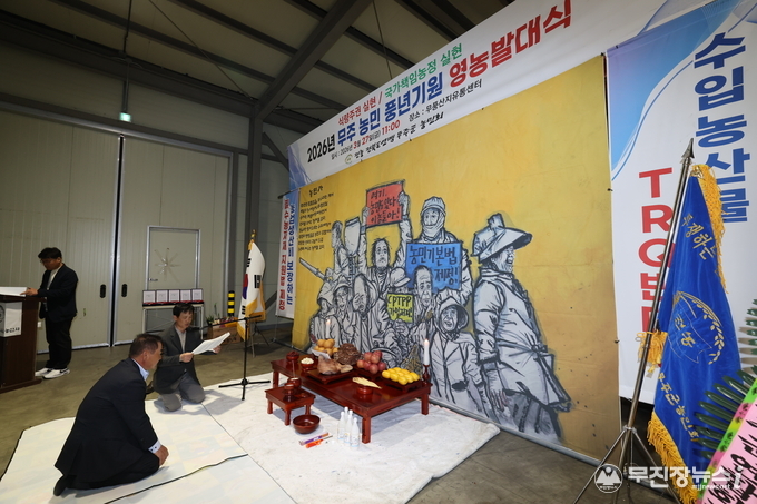 무주군이 27일 ‘영농발대식 및 풍년기원제’를 통해 올해 농사의 시작을 알렸다. 무주군 농민회가 주관한 가운데 무풍면 산지유통센터에서 열린 이날 행사는 풍물 공연을 시작으로 개회식과 영농 발대 선언, 풍년기원제 순으로 진행됐다.