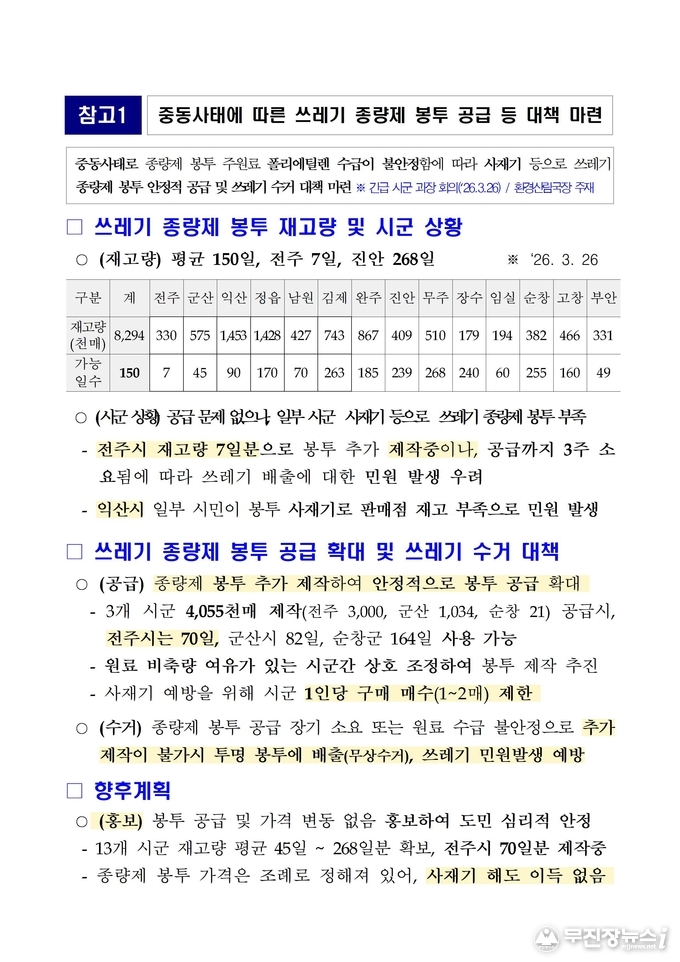 이순택 전북자치도 환경산림국장은 “쓰레기 종량제봉투 공급 현황을 실시간으로 점검하고 있으며, 공급 차질 등 비상 상황에 대비해 스티커 부착 또는 일반봉투 배출 후 수거가 가능하도록 하는 대책도 마련 중”이라며, “종량제봉투 가격은 인상되지 않는 만큼 불안감에 따른 사재기는 자제해 주시고, 도민 여러분께서는 평소처럼 배출해 주시길 바란다”고 당부했다.