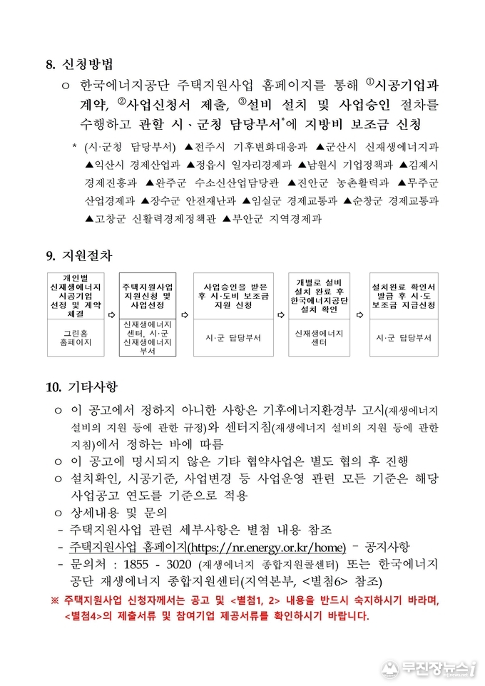 배주현 전북자치도 청정에너지수소과장은 “재생에너지 보급 확대는 도민의 에너지 부담을 줄이는 동시에 지역의 지속가능한 미래를 준비하는 핵심 정책”이라며 “초기 설치비 부담을 완화해 더 많은 도민이 재생에너지를 활용할 수 있도록 지원을 확대해 나가겠다”고 말했다.
