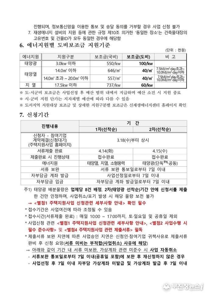 신청은 한국에너지공단 주택지원사업 홈페이지를 통해 진행되며, 에너지원별로 접수 일정이 구분된다. 태양열·지열·소형풍력은 4월 14일, 태양광은 4월 15일부터 접수되며, 예산 소진 시까지 선착순으로 지원이 이뤄진다.