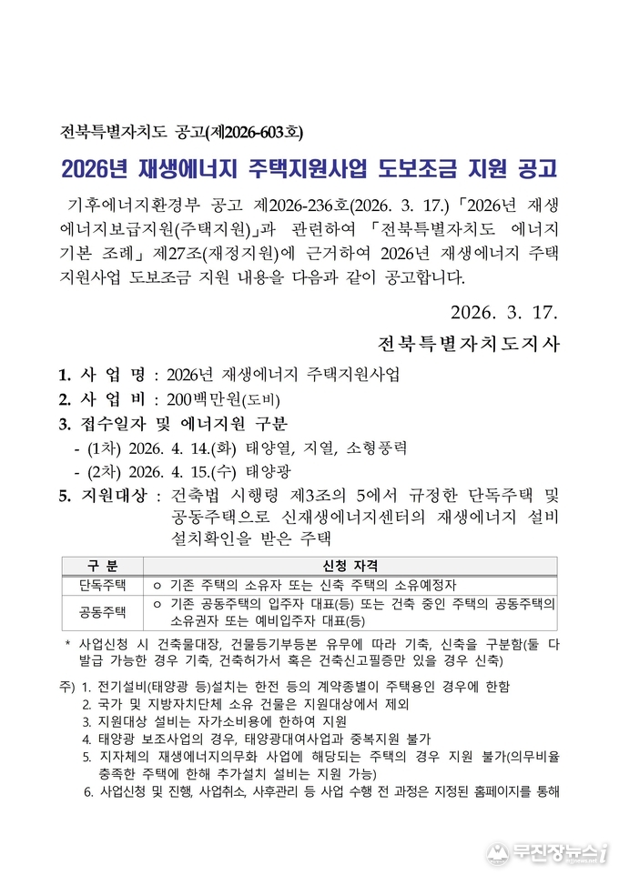 전북특별자치도가 재생에너지 보급 확대를 위해 ‘2026년 재생에너지 주택지원사업’을 본격 추진한다고 27일 밝혔다. 총 사업비 20억 원 규모로, 초기 설치비 부담을 완화해 도민들의 재생에너지 도입 촉진을 목적으로 한다.