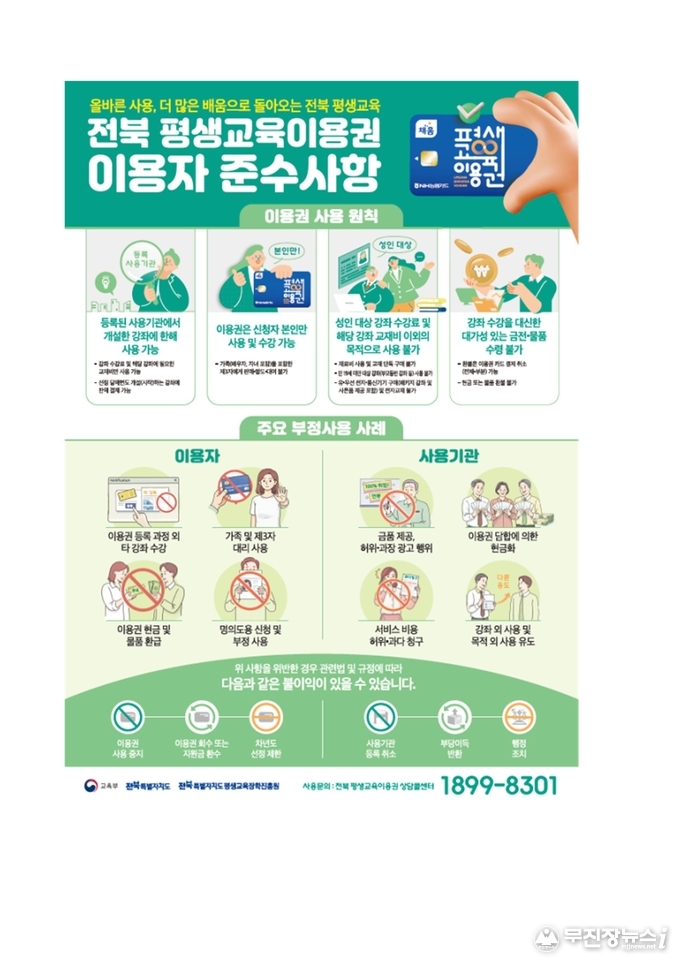 이현웅 전북평생교육장학진흥원장은“이번 평생교육이용권이 배움의 기회에서 소외된 도민들에게 실질적인 변화의 계기가 되길 바란다”며, “사용기관도 운영지침을 준수해 공정하고 투명한 사업이 될 수 있도록 협조해달라”고 당부했다.