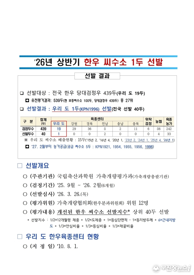 선발된 씨수소(KPN1996)는 도체중과 근내지방도가 우수해 성장성과 육질이 뛰어난 것이 특징으로, 전북자치도가 추진 중인 ‘저탄소 한우 육성 정책’에도 부합하는 개체로 평가받고 있다.