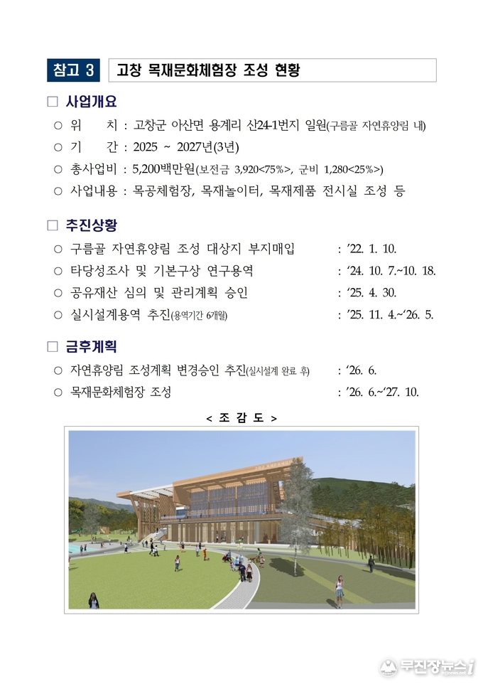 우선 도내 목재문화체험장을 확충하기 위해 고창군에 총 52억 원을 투입해 2027년 완공 목표로 신규 조성 중이며, 기존 4개소(무주, 임실, 장수, 정읍)를 통해 연간 약 2.3만 명의 도민에게 목재 교육 서비스를 제공하고 있으며
