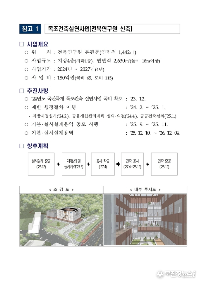 이 사업은 단순히 연구원 건물을 짓는 것을 넘어, 공공 부문에서 탄소 저장고인 목재의 가치를 증명하고 전북자치도가 목재산업의 거점으로 거듭나는 이정표 역할을 할 것으로 기대하고 있다.