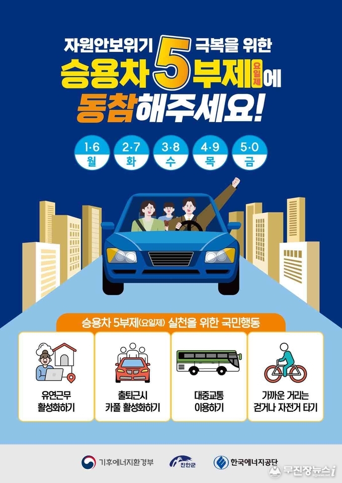 진안군은 중동 지역의 정세 불안에 따른 에너지 수급 위기에 대응하기 위해, 정부 지침에 따른 ‘진안형 승용차 5부제(요일제)’를 3월 31일까지 준비기간을 거쳐 오는 4월부터 본격 시행한다.