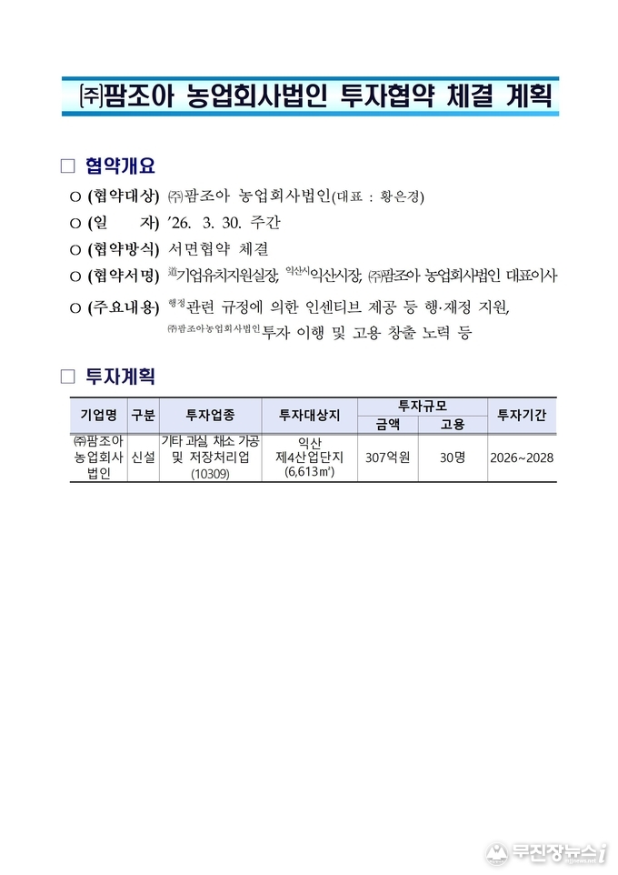 이번 협약에 따라 ㈜팜조아는 익산 제4산업단지에 307억 원을 투자하고 30명의 신규 인력을 채용할 계획이다. 투자 기간은 2026년부터 2028년까지다.
